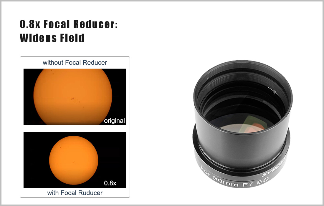 Quang học được phủ nhiều lớp có độ bóng cao và thân bằng nhôm hoàn thiện anodize cứng để giúp giảm trọng lượng. Đầu máy ảnh của bộ giảm tốc / làm phẳng có các luồng M48x0,75 để kết nối với lưỡi lê của máy ảnh (Hỗ trợ Máy ảnh Full Frame), trong khi phía kính thiên văn là 2 inch tiêu chuẩn để kết nối với ống kính chính, cũng bao gồm một bộ lọc tiêu chuẩn 2 ” để thêm bộ lọc ô nhiễm ánh sáng mà bạn cần. Tiêu cự trở lại mặc định là 55mm. Mặt trước của kính thiên văn 70mm là ổ cắm M54x0,75 để kết nối với thấu kính chính.
