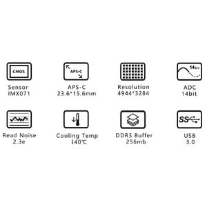 - APS-C định dạng (28 . 4mm chéo) với 4. 78 um kích thước pixel – lý tưởng cho nhiều loại kính thiên văn